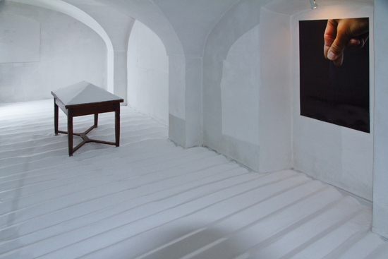 Im kleinen Gewölbe des Schlosses Adelsheim präsentiert Bärbel Hische mit ihrer raumgreifen- den Installation „Schattenweiß“ ihre künstlerische Gedankenreise zum kristallinen Mineral. Auf dem Boden und einem Esstisch türmen sich überbordende Salzhaufen, eine Tonne weiße Masse, die in Wellenform an eine bewegte Meeresfläche erinnert. In den Gewölbebögen kann der Betrachter parallel zwei Filme erleben, in denen lyrisch-nachdenklich vom Ernten der Salzblumen und der Verwendung von Salz erzählt wird. Das Betrachten der üppigen Salzlandschaft führt in einen weitläufigen Gedankenraum, in Sphären von Brauchtum, Nahrung und Produktion. Es entfalten sich viele Fragen vom Umgang des Menschen mit dem wertvollen Naturprodukt Salz, das der Erde so mühsam abgerungen wird, ohne das Leben jedoch nicht möglich wäre. Dr. Sabine Isensee, Stadtmuseum Oldenburg