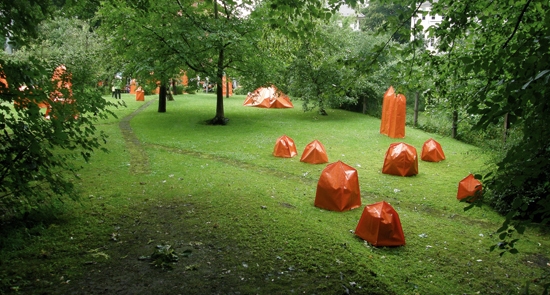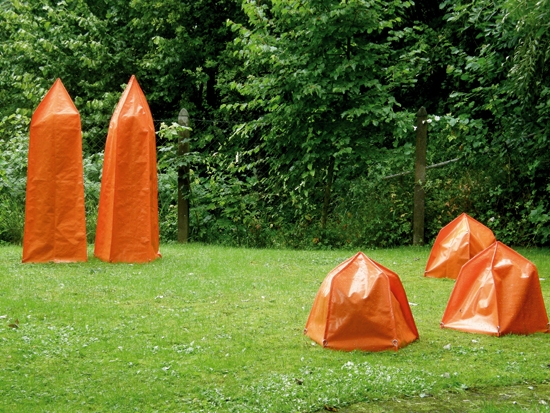 Installation mit maßgefertigten Hauben für 29 fest installierte Kunstwerke im Skulpturenpark des Architekturmuseums Augsburg