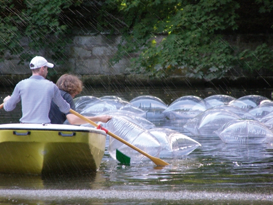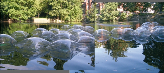 100 wasserbefüllte Kunststoffkissen, 0.80 x 0.80 m, Ort: Schwänchenteich in Göttingen